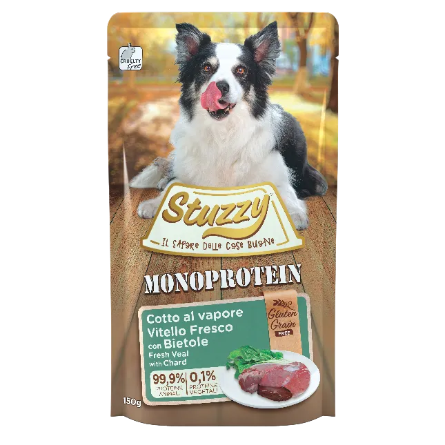 Una ricetta monoproteica per cani ricca di gusto e fantasia. Scopri Stuzzy Monoprotein Vitello con bietole. Ingredienti selezionati e cotti al vapore, in un alimento completo, con una sola fonte di proteine animali, che coniuga sapori autentici e benessere nutrizionale.